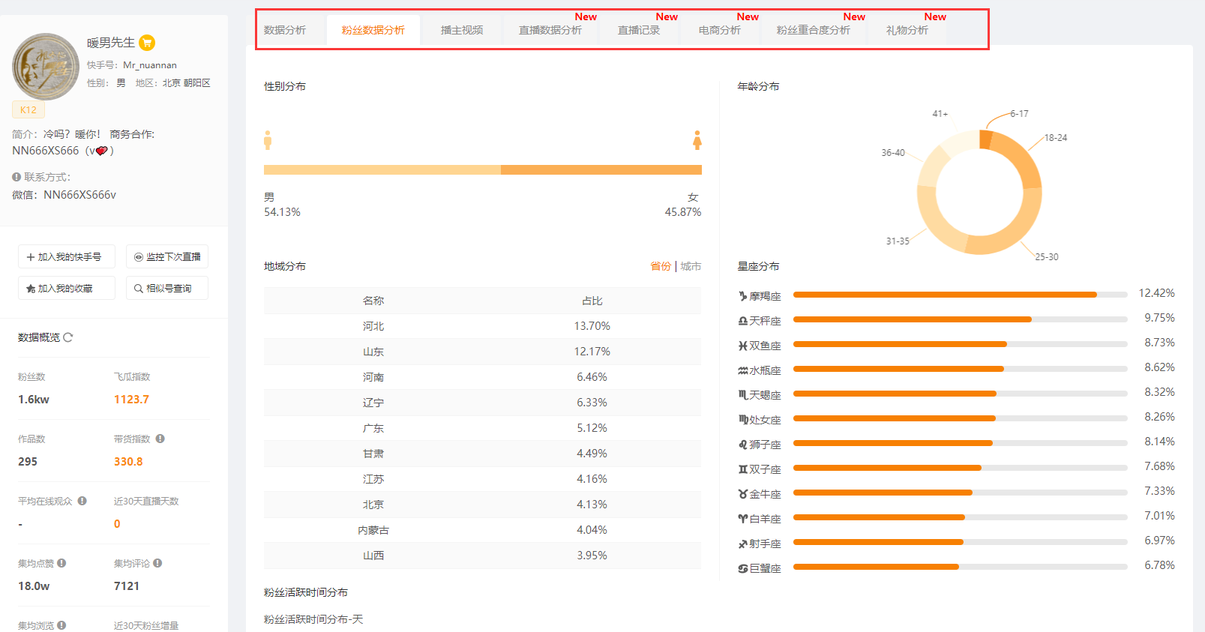 2)在播主詳情頁面中,我們可以快速了解到自己快手號的粉絲數(shù)據(jù)、視頻數(shù)據(jù)分析、直播數(shù)據(jù)分析、直播記錄、快手號電商分析、粉絲重合度分析及禮物情況的分析等,飛瓜數(shù)據(jù)快手版還有很多的功能,大家可以去使用下。