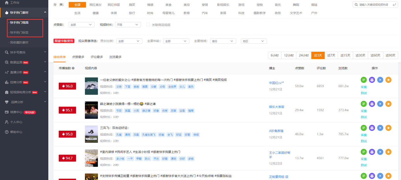 1)在飛瓜數(shù)據(jù)快手版的熱門視頻、熱門標簽里面我們可以第一時間了解到快手平臺的熱門視頻內(nèi)容創(chuàng)作方向及熱門標簽的相關數(shù)據(jù)情況,快速上熱門。